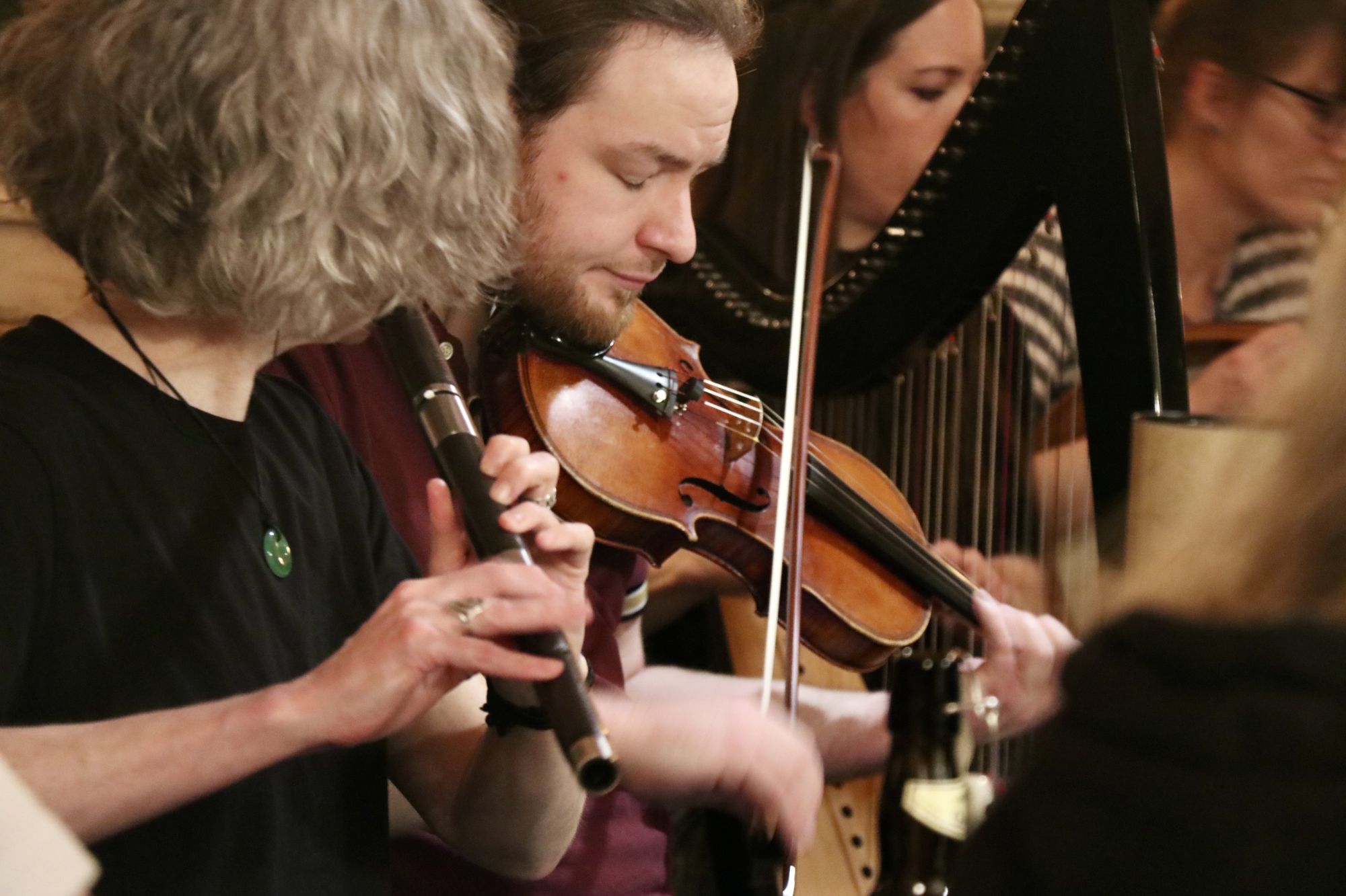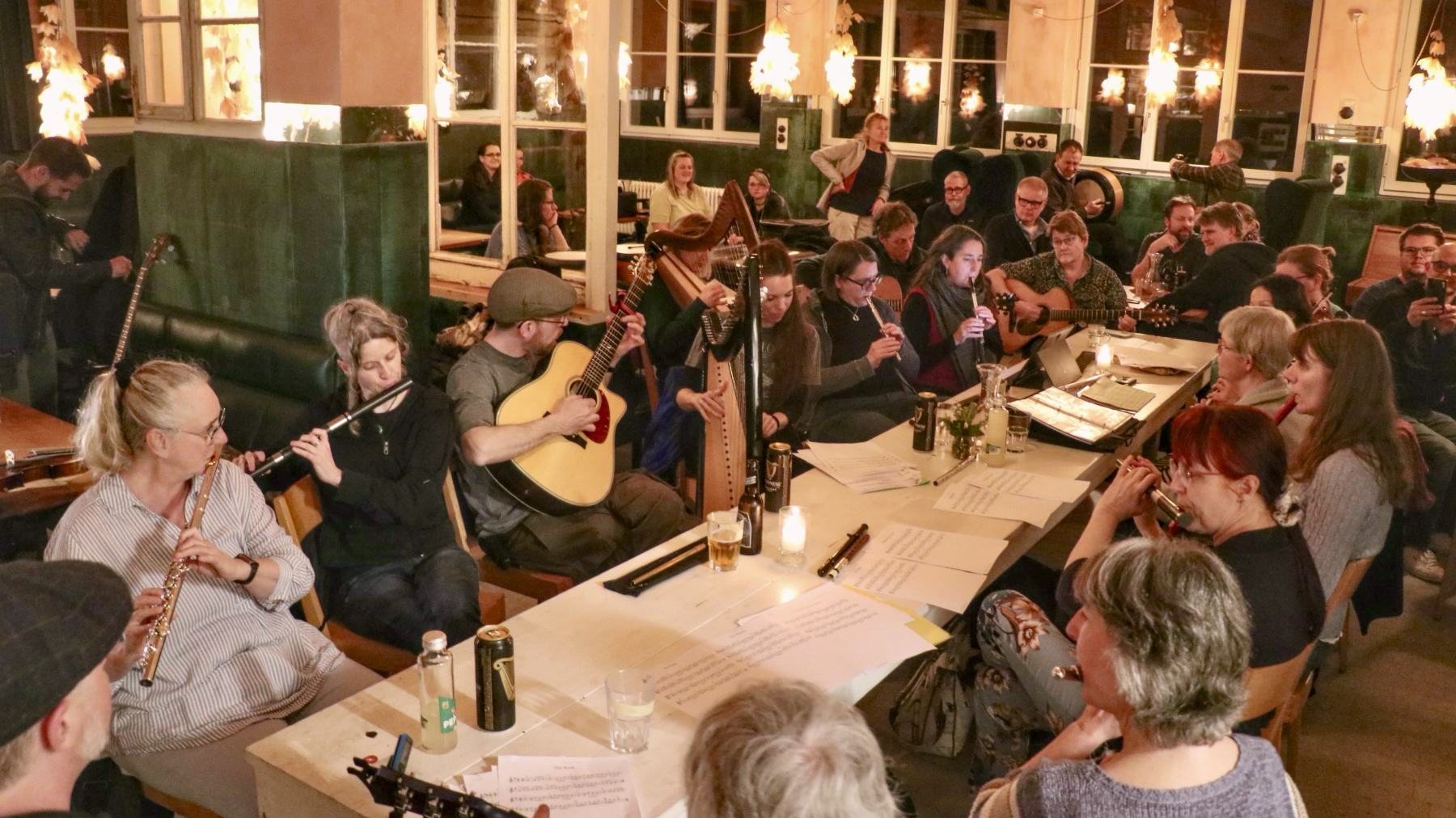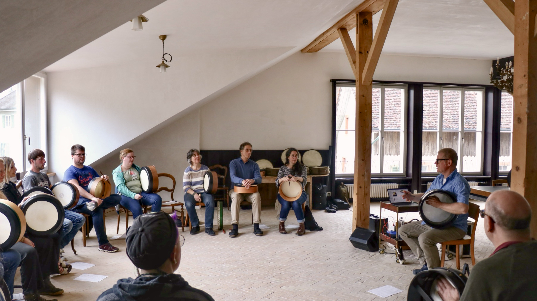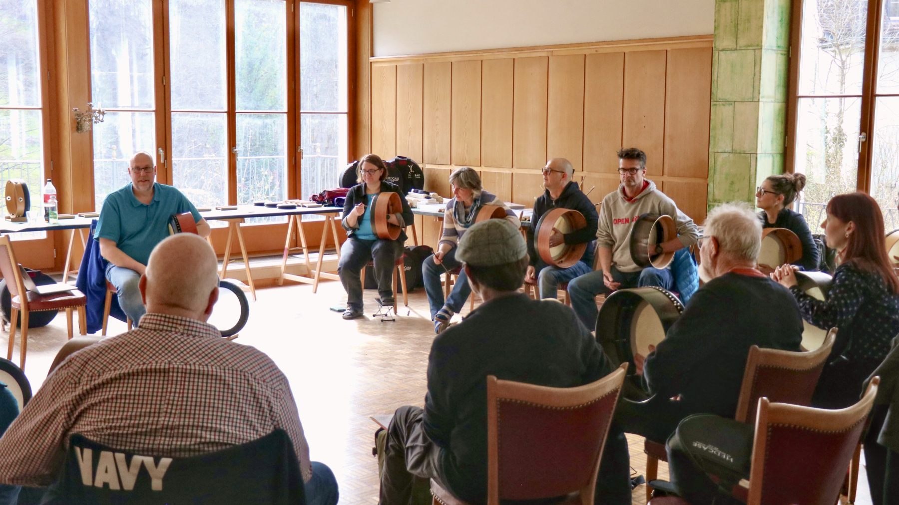 Das BodhránWeekend lebt nicht nur vom qualifizierten Unterricht – auch das Rahmenprogramm dreht sich ganz um die Bodhrán: Ein Fachvortrag, etwa zu Bodhránbau oder -geschichte, bereichert das Programm – oft mit externen Referent:innen. Am Samstagabend gibt es ein Konzert mit einer renommierten Irish-Folk-Band, gefolgt von einer Session, die sich bisher jedes Mal ergeben hat. Bereits am Freitagabend stimmen wir uns nach der ersten Unterrichtseinheit mit einer Slow Session und einem Whiskey Tasting auf das Wochenende ein. Zudem bietet das BodhránWeekend eine besondere Gelegenheit, Instrumente und Zubehör zu testen, zu vergleichen und zu erwerben. Regelmäßig ist der weltweit führende Tippermaker Stevie Moises mit seiner mobilen Drehbank vor Ort – er steht auch zwischen den Unterrichtseinheiten mit Rat und Tat zur Seite.